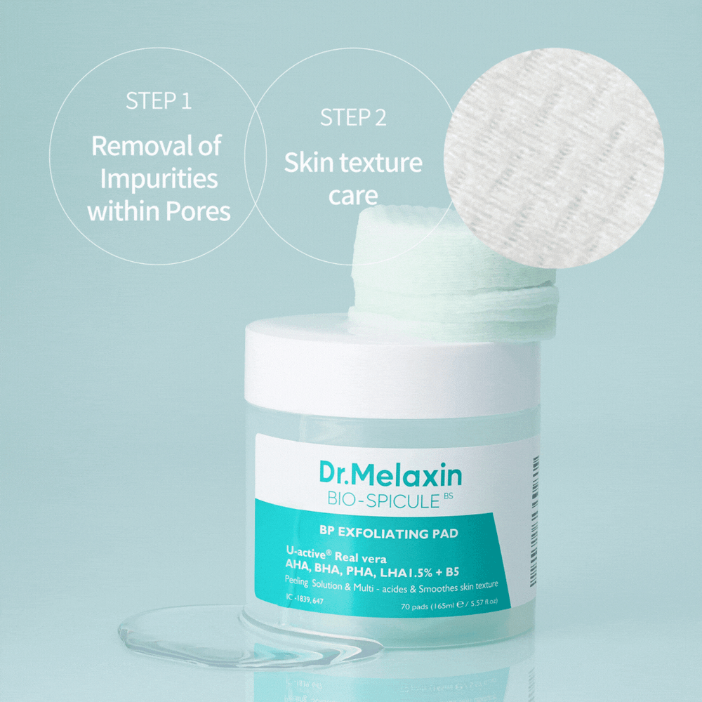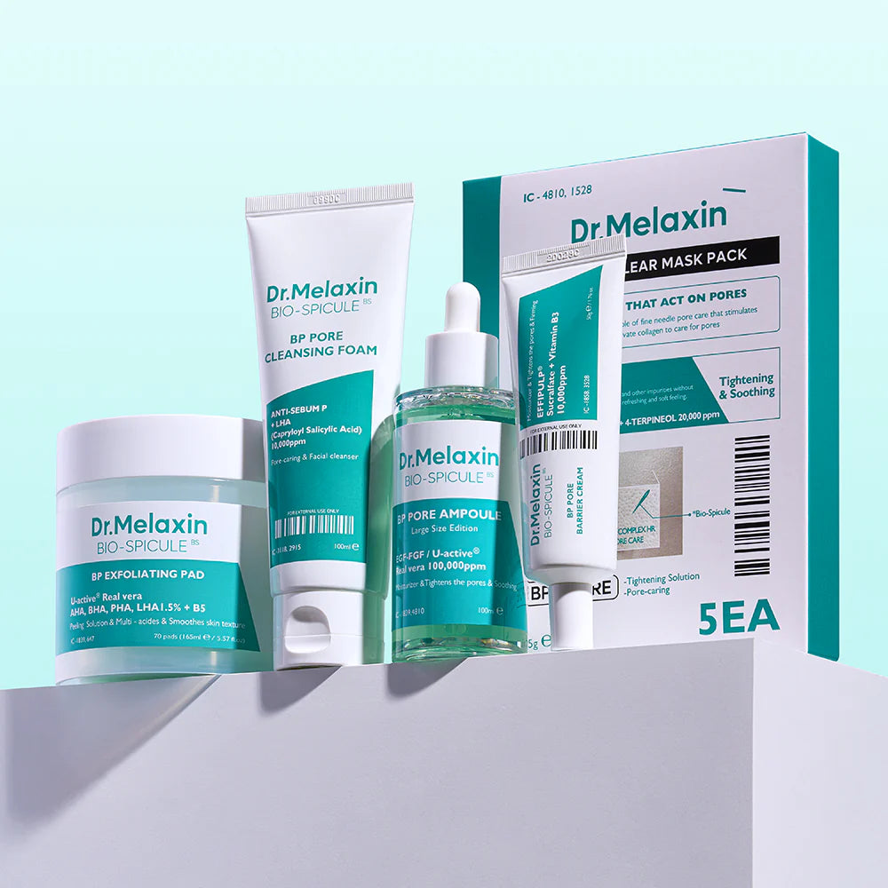 Explore the advanced skincare science of Dr. Melaxin's BP Pore Care Line. This comprehensive regimen leverages revolutionary Bio-Spicule technology across four targeted products: BP Pore Core Cleansing Foam, BP Exfoliating Pads, BP Pore Ampoule, and BP Pore Barrier Cream. Each is crafted to effectively address enlarged pores, control sebum production, and refine skin texture for a visibly smoother complexion.