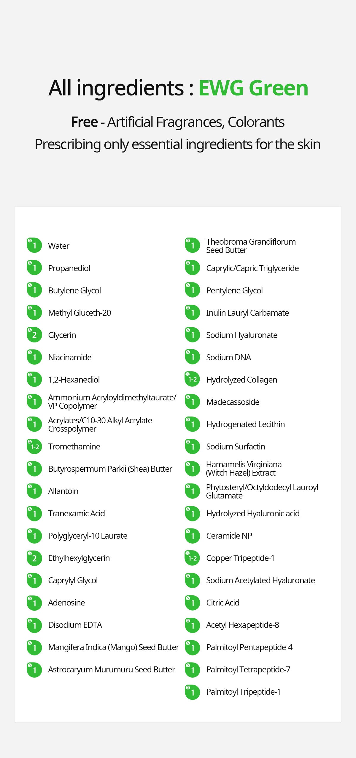 Water, Propanediol, Butylene Glycol, Methyl Gluceth-20, Glycerin, Niacinamide, 1,2-Hexanediol, Ammonium Acryloyldimethyltaurate/VP Copolymer, Acrylates/C10-30 Alkyl Acrylate Crosspolymer, Tromethamine, Butyrospermum Parkii (Shea) Butter, Allantoin, Tranexamic Acid, Polyglyceryl-10 Laurate, Ethylhexylglycerin, Caprylyl Glycol, Adenosine, Disodium EDTA, Mangifera Indica (Mango) Seed Butter, Astrocaryum Murumuru Seed Butter, Theobroma Grandiflorum Seed Butter, Caprylic/Capric Triglyceride, Pentylene Glycol, Inulin Lauryl Carbamate, Sodium Hyaluronate, Sodium DNA, Hydrolyzed Collagen, Madecassoside, Hydrogenated Lecithin, Sodium Surfactin, Hamamelis Virginiana (Witch Hazel) Extract, Phytosteryl/Octyldodecyl Lauroyl Glutamate, Hydrolyzed Hyaluronic Acid, Ceramide NP, Copper Tripeptide-1, Sodium Acetylated Hyaluronate, Citric Acid, Acetyl Hexapeptide-8, Palmitoyl Pentapeptide-4, Palmitoyl Tetrapeptide-7, Palmitoyl Tripeptide-1